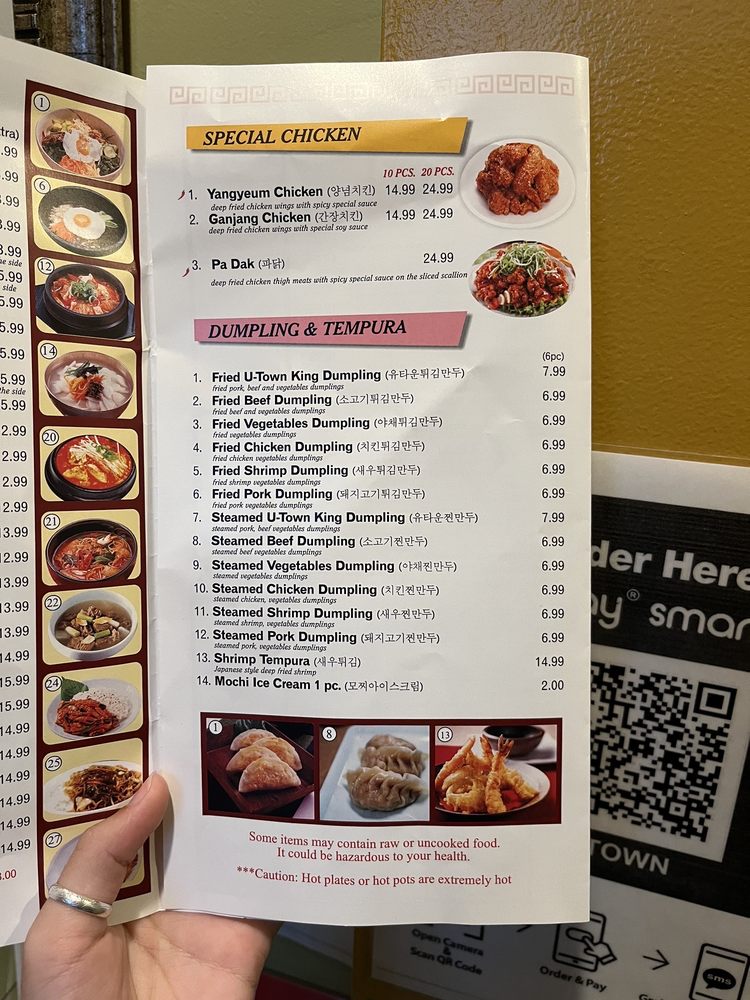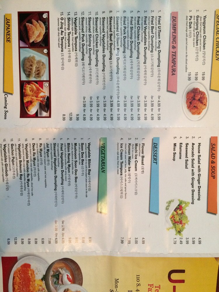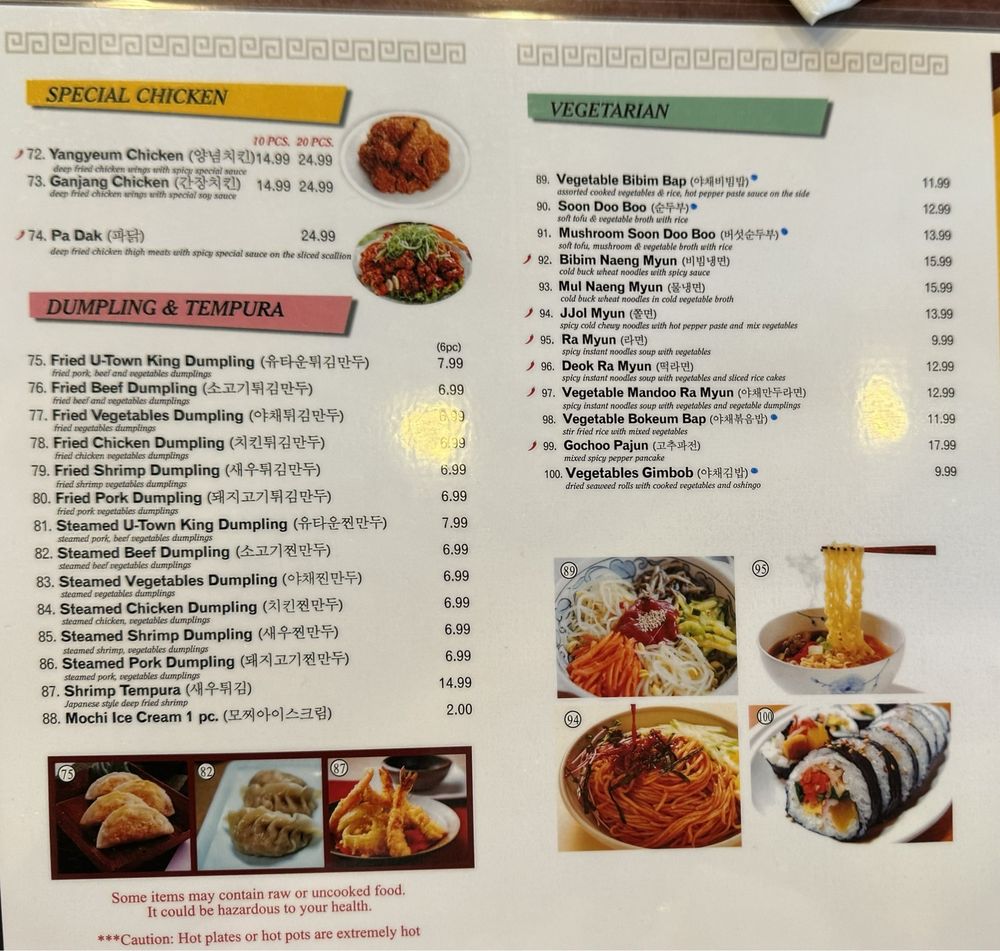 U-Town, a fusion of Korean, Japanese, and Asian cuisine, boasts a diverse menu with options for vegetarians and non-vegetarians alike. The highlights include Fried UTown King Dumplings, Grilled Spicy Pork Belly Combos, and the popular Bulgogi Bibim Bap. Customers rave about the quality and generous portions, with many praising the clean and homey flavors of dishes like the Chicken Ginseng Soup and Tofu Soup. The ambiance is cozy, making it ideal for lunch or dinner gatherings. With reasonable prices, complimentary banchan, and a variety of vegetarian choices, U-Town stands out as a top choice for Korean food in University City. Whether you're a spice enthusiast or prefer milder flavors, there's something for everyone at this inviting establishment.